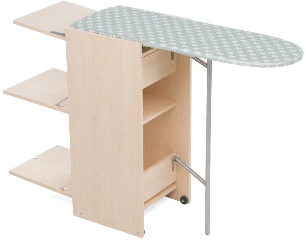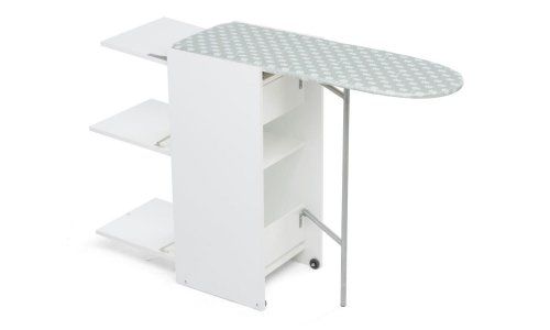 Mueble que incorpora una tabla de planchado retráctil. Dispone de ruedas para su fácil desplazamiento