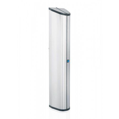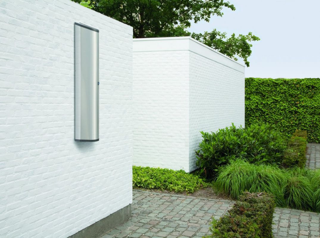 Tendedero plegable que sin ropa está recogido en una caja de acero inoxidable de pequeña dimensión y extendido tiene una gran capacidad de tendido, con sus 24 metros de cuerda.